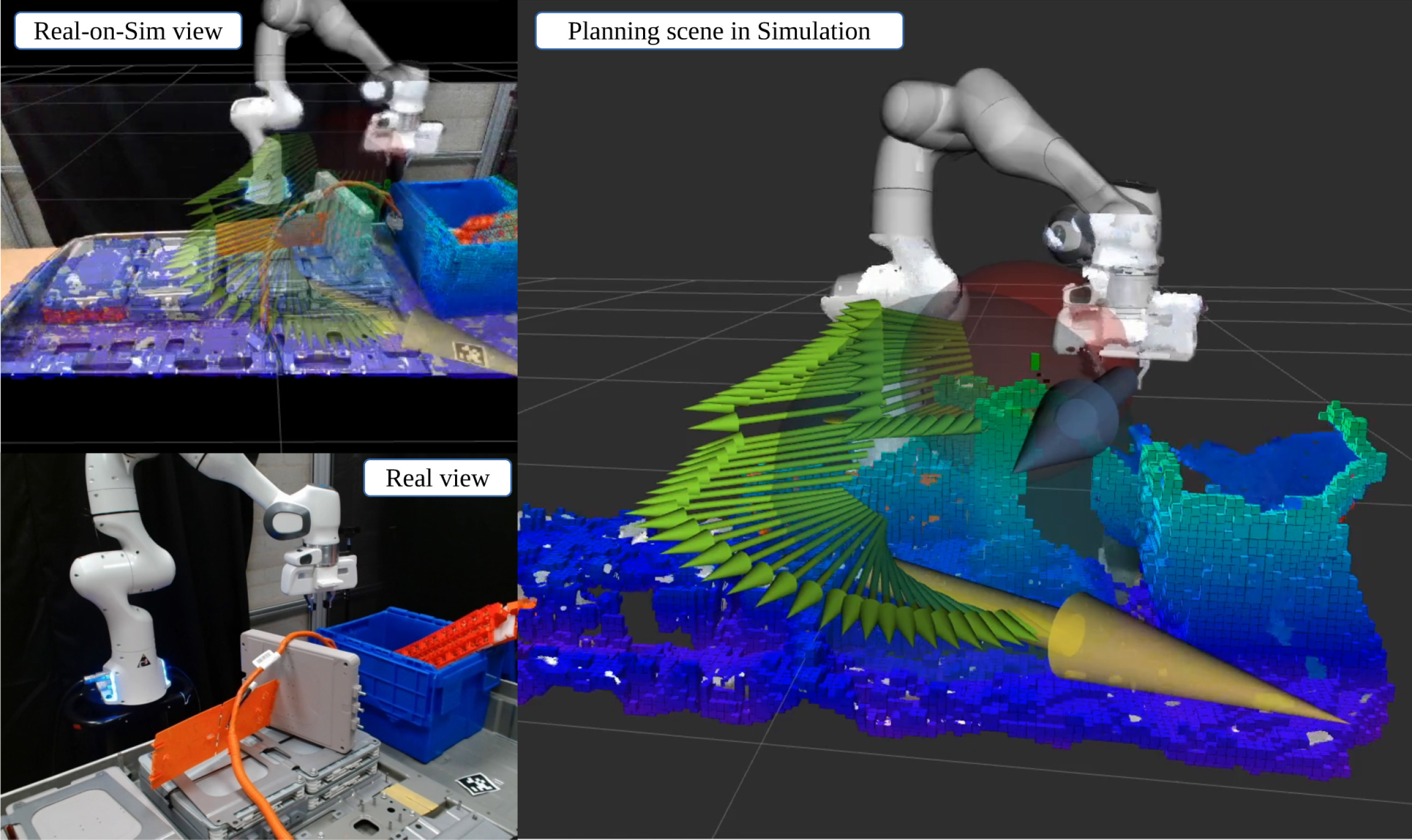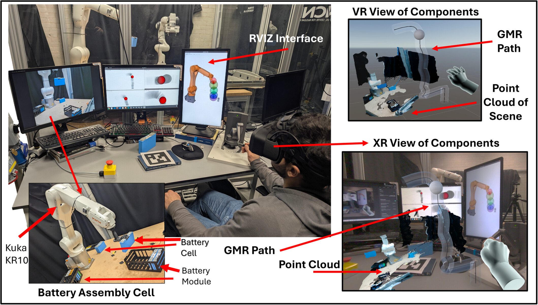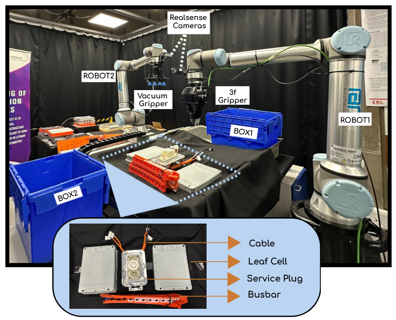 Research Multi-Robot Task and Motion Planning A Task and Motion Planning (TAMP) framework for multi-robot EV battery disassembly, combining symbolic task planning, vision-based perception, and learned motion generation. Haptic Teleoperation in XR A teleoperation framework for EV battery cell handling, integrating haptic feedback, extended reality (XR) visualization, and adaptive trajectory generation. Task-Parameterized Motion Planner Efficient motion planning for robotic manipulation in constrained environments using GMM-Informed RRT planners. Tele-robotics for Disassembly A comparative study of telerobotic systems for the disassembly of electric vehicle batteries, focusing on the impact of haptic feedback on task performance. Master's Master's Thesis Comparative analysis of a Peg-In-Hole Internship Bilateral Tele-operation of Kuka Iiwa via Touch haptic device Lab project Tele-operating a Cable-driven robot via Touch haptic device Object detection Peg-in-Hole task using sensor-fusion F/T sensors and 2D camera image Bachelor's VET-ENG Erasmus +KA2 VET-ENG project. Bachelor's Thesis Tele-operation of a custom-made 7DOF from a VR scene